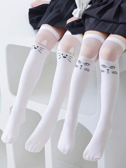 2對/組女童可愛的狐狸和貓圖案透明膝高襪,具有網狀和玻璃纖維細節,透氣性和親膚性適合日常穿著 - 白色 - 查看 2
