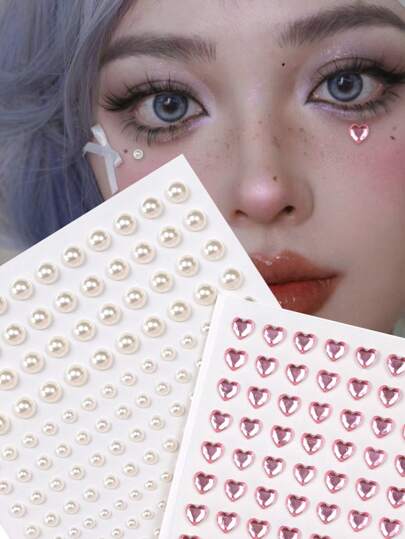 2入組3d模擬珍珠混合粉紅心形眼睛和下眼睫貼紙,附有鑲嵌裝飾,適用於舞臺化妝、音樂節、y2k 聚會 - 彩色 - 查看 1