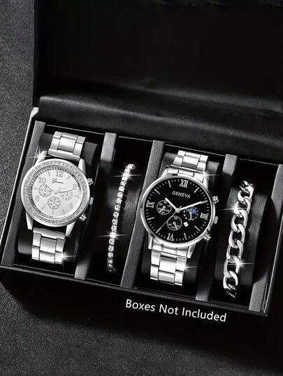2只/4只情侣手表套装,男士商务日历石英腕表,时尚水晶石英表及手链套装,适合日常佩戴、返校季、毕业季、感恩节、情侣装,最佳礼物。不含表盒。 - A - 查看 1