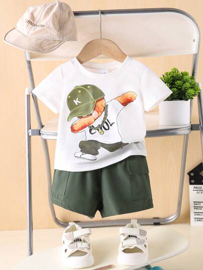 2 件装男婴休闲卡通熊印花圆领 T 恤和工装短裤套装,夏季运动装 - 白色 - 查看 1