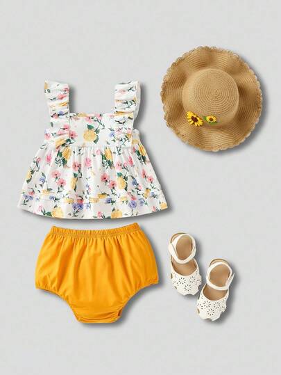 Joliand Joliand 2 件女婴优雅花卉印花背心上衣和黄色短裤套装,适合日常、居家、户外、海滩和夏季 - 彩色 - 查看 1