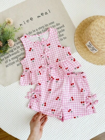 SHEIN LMoss Kids LMoss 女婴两件套 女婴格子圆领无袖上衣和短裤套装 樱桃图案婴儿服 樱桃图案女婴服 粉色格子樱桃图案婴儿服两件套 女婴樱桃图案婴儿服 女婴夏季服 樱桃印花婴儿服 粉色格子婴儿套装 女婴两件套 - 粉色 - 查看 2