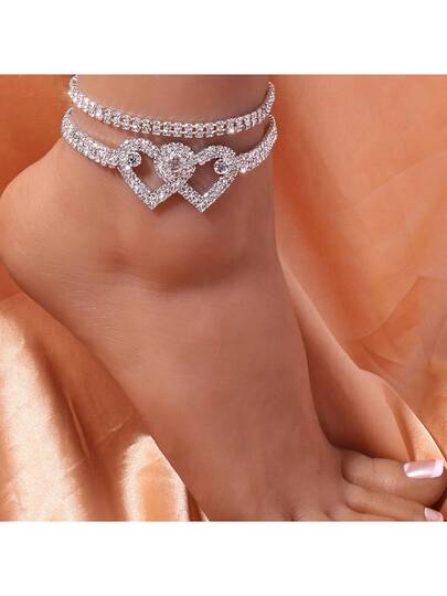 2入組美麗閃亮的立體切割鋯石鏈鉤踝鍊,時尚白銀鏈踝飾品,適用於赤足沙灘鞋