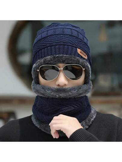 2 件蓝色针织帽和围巾套装,涤纶面料,冬季保暖,带保暖衬里,加厚,男士针织帽和颈巾 - 藍色 - 查看 2