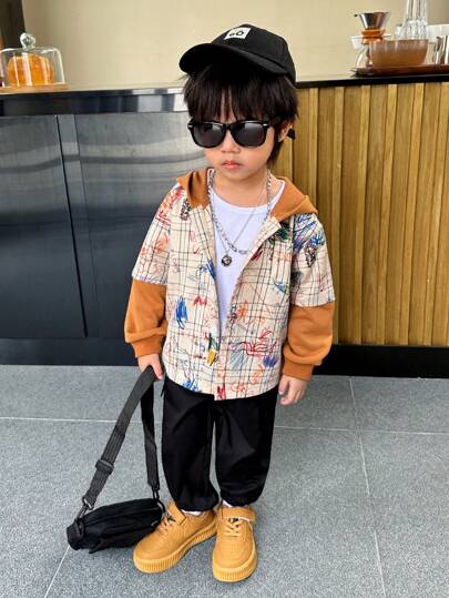 SHEIN 2入組男童休閒塗鴉格紋2合1連帽外套和褲子套裝,街頭風格 - 彩色 - 查看 1