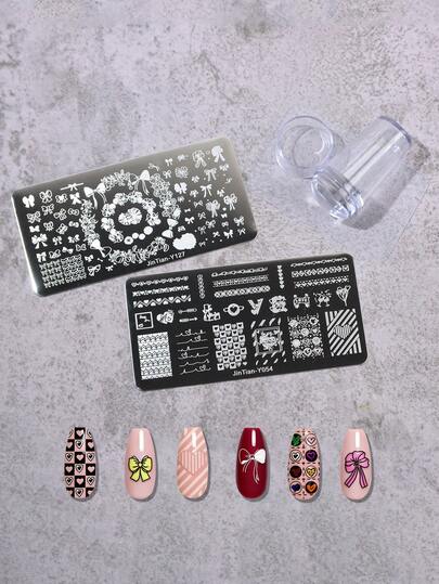 2片蝴蝶和心形花卉图案美甲印花板,1个带盖美甲印章,美甲印花工具套装(含刮刀)