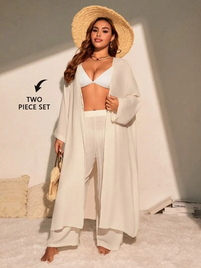 SHEIN Slayr CURVE 2 件套休闲基本款长款罩衫套装,加大码,适合夏季海滩度假 - 杏色 - 查看 1