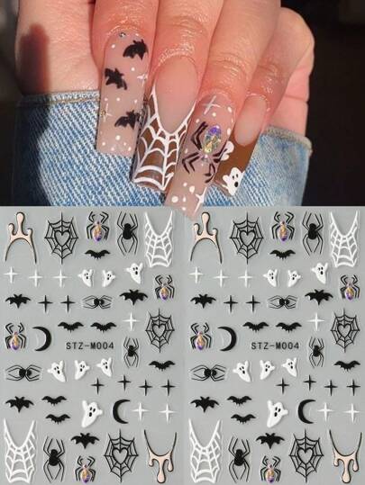 2 件黑暗万圣节蝙蝠幽灵黑白蜘蛛与心形蜘蛛网 3D 浮雕美甲贴纸星月 Y2K 闪亮滑块设计卡通可爱指甲贴花节日 DIY 美甲用品饰品装饰品