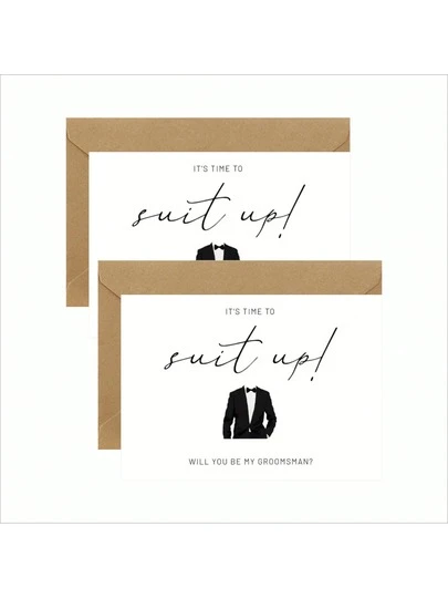 两张优雅伴郎邀请卡 - “是时候穿上西装了!”配以燕尾服插图,完美适用于婚礼庆典,绅士英文问候语 - 駝色 - 查看 10
