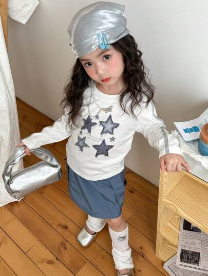 SHEIN 2 件女童休闲时尚牛仔星星和文字印花白色长袖 T 恤和蓝色工装口袋裙套装 - 白色 - 查看 1
