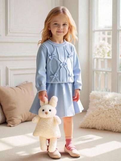 Souflis Souflis 2 件女童毛衣套装:蝴蝶结钻石图案圆领套头毛衣和褶皱 A 字形钻石格子裙,优雅蓝色,适合万圣节、圣诞节、返校 - 淺藍色 - 查看 1