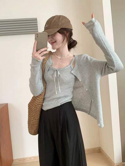 2 件灰色吊带背心和针织开衫套装,优雅修身女士上衣,秋季 - 灰色 - 查看 1