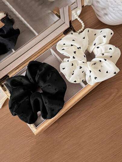 2 件心形和圆点图案缎面发圈,流行独特多功能发饰,发髻夹,马尾辫夹,发圈,发绳,发球 - 彩色 - 查看 1