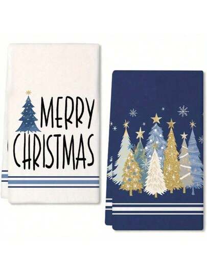 2pcs Highly Absorbent Polyester Festive Christmas Kitchen Towels - Blue Tree Design, 18x26 Inches For Holiday Home Decor, Cooking, Baking, And Cleaning - 2pcs - 查看 2