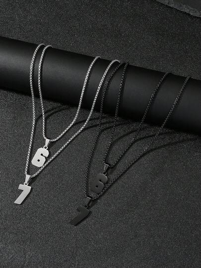 2件套简约不锈钢黑色阿拉伯数字67吊坠项链套装,配不锈钢链,男士礼品及日常佩戴之选 - 不銹鋼數位項鍊套裝 - 查看 2