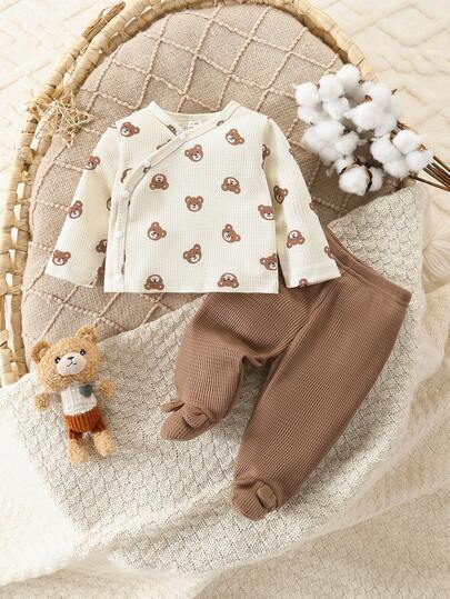 2件套新生儿华夫格纹开衫上衣和连脚裤套装,可爱小熊印花设计 - 卡其色 - 查看 2