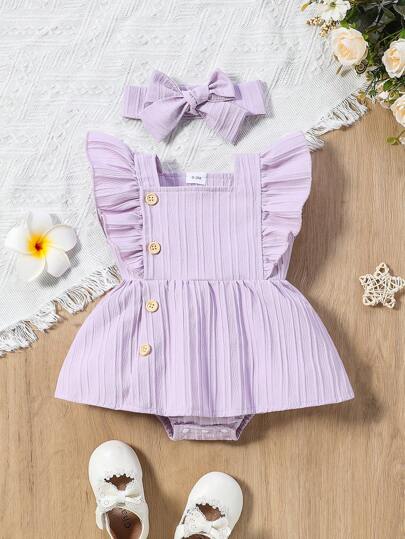 新生儿两件套服装:休闲简约时尚蓝色提花荷叶边连体衣连衣裙和蓝色发带,夏季日常穿搭 - 紫色 - 查看 1