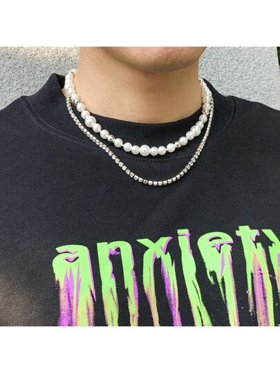 2入組鑲有螢石、鏈條和人造珍珠的項鍊套裝,適合男士參加派對穿著 - 銀色 - 查看 2