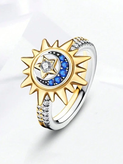 2枚/套 925纯银太阳、星星和月亮设计戒指,闪亮优雅的情侣戒指,适合婚礼、舞会、派对等场合,精美珠宝 - 彩色 - 查看 10