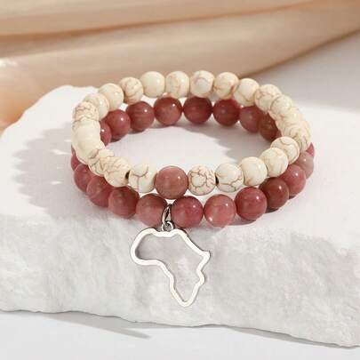 2件套波西米亚风粉白撞色串珠手链,不规则地图形状吊坠,多层弹力手链 - 粉紅白色串珠手鍊 - 查看 2
