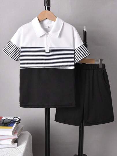 男童休闲条纹Polo衫和纯色短裤套装(2件套),春夏款 - 黑與白 - 查看 1