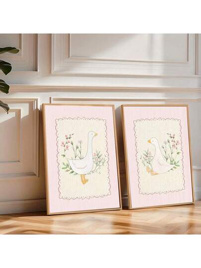 2件套无框粉色傻鹅儿童房海报帆布画,中性简约可爱农场动物图案,适合女婴房墙面装饰,也适用于托儿所、游戏室、卧室和其他现代家居装饰。 - 彩色 - 查看 2