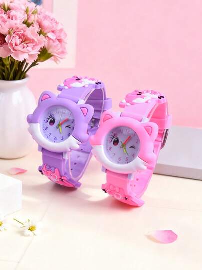 2件套 女孩卡通可爱眨眼猫软硅胶表带儿童指针手表,学生创意动物图案石英腕表 - 彩色 - 查看 3
