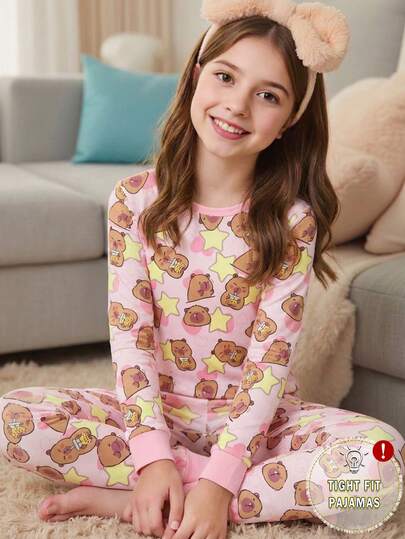 2 件套女童可爱熊和星星印花圆领长袖上衣和紧身裤睡衣套装,柔软有弹性的针织面料 - 彩色 - 查看 2