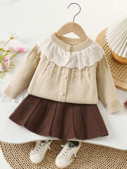 2 件套女童冬季服装针织开衫和百褶裙,可爱荷叶边毛衣夹克和裙子,儿童服装 - 卡其色 - 查看 1