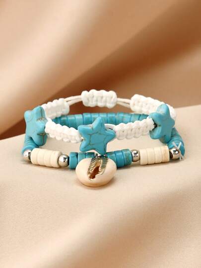 2 件套手工编织星形手链,波西米亚风格贝壳手链,时尚优雅串珠手链,可调节情侣手链,休闲百搭日常佩戴 - 彩色 - 查看 1