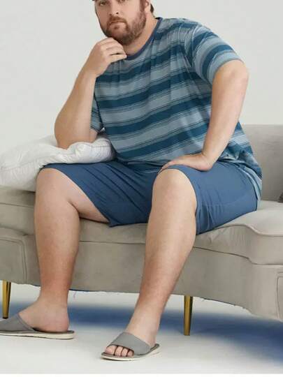 2 件套大码男士蓝色条纹 T 恤和纯蓝色短裤睡衣套装 - 藍色 - 查看 1