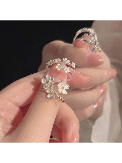 2 件復古別緻花朵設計開放式指環,時尚優雅套裝 - 銀色 - 查看 11