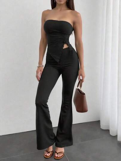 2件套青少年女孩露肩不对称上衣和高腰休闲喇叭裤套装 - 黑色 - 查看 1