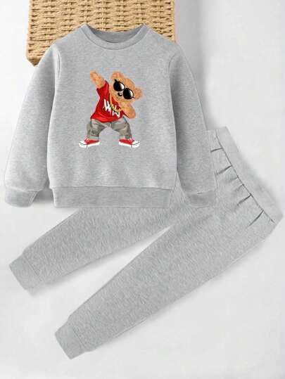 SHEIN 2 件套年轻男孩新款时尚卡通印花圆领长袖运动衫和裤子休闲运动装秋冬季 - 灰色 - 查看 1
