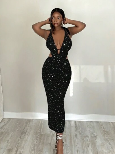 Slaydiva 2 件套女士优雅亮片挂脖开叉迷你裙 - 黑色 - 查看 5
