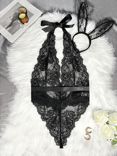 2 件套女士蕾丝内衣服装(连体裤和头饰) - 黑色 - 查看 9