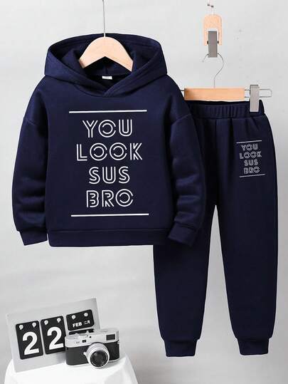 2 件套年轻男孩字母印花保暖连帽衫和裤子休闲装,秋季 - 寶藍色 - 查看 2