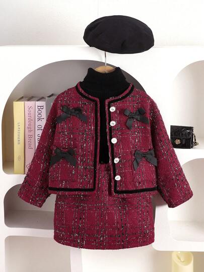 2 件套年轻女孩蝴蝶结装饰圆领长袖夹克和迷你裙套装,适合春秋季节 - 紅色 - 查看 2