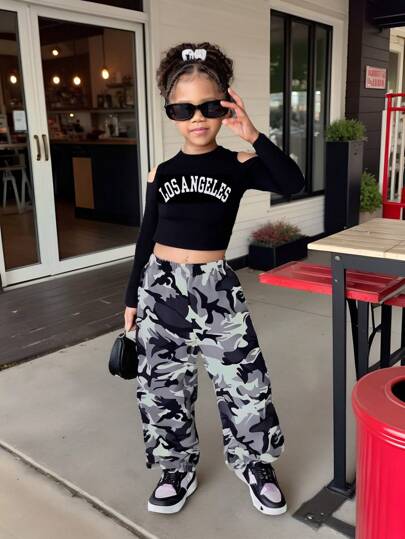 2 件套少女字母印花镂空肩部短款针织上衣和迷彩印花松紧腰宽松裤套装,春秋季休闲装 - 黑色 - 查看 1