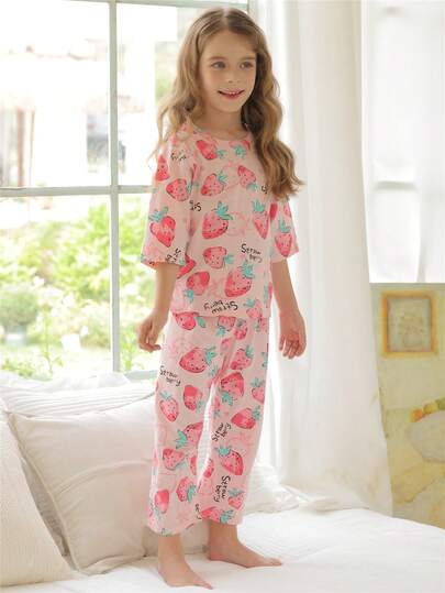 2 件套年轻女孩卡通印花短袖上衣和 3/4 裤睡衣套装,轻盈夏季