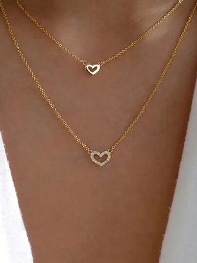 2入組簡約鍍金項鍊,鑽石鑲嵌心形吊墜,適合女性日常佩戴 - 金色 - 查看 1