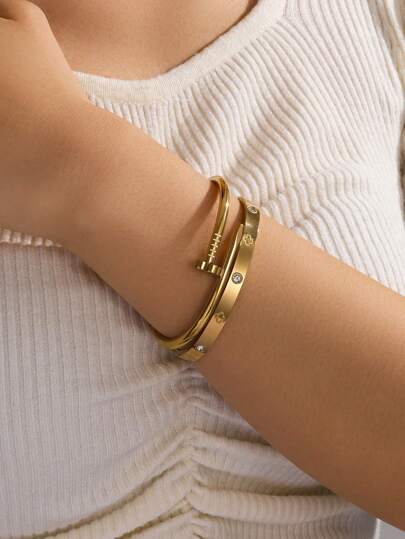 2 件不锈钢钉子和四叶草手链及配套四叶草手链套装,适合女性日常佩戴、圣诞礼物、节日赠送 - 金色兩件套 - 查看 2