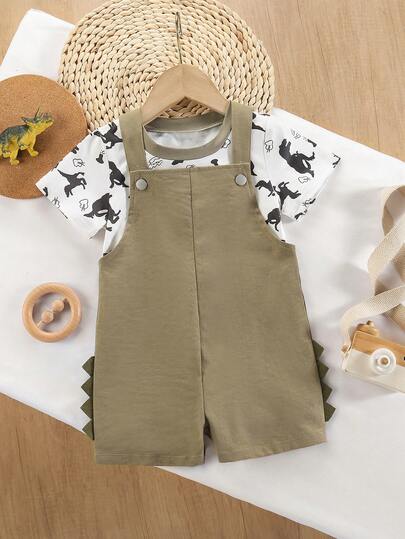 2件套幼儿/儿童恐龙全印花圆领T恤和简约锯齿形运动透气背带裤套装,男女通用