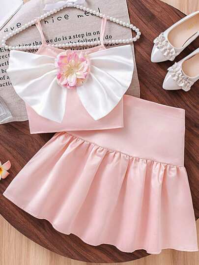 2 件套青少年女孩优雅套装:3D 花卉前背心衬衫和裙子 - 白色 - 查看 3