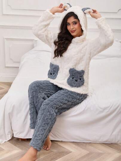 2件套女士秋冬法兰绒小熊图案口袋熊耳连帽衫上衣和纯色裤子蓬松睡衣套装,舒适保暖 - 藍白色 - 查看 1