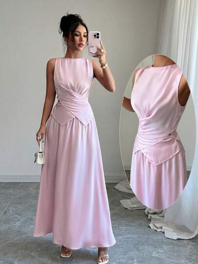 Chiquease 2 件套女士夏季优雅缎面低胸无袖上衣和喇叭中长裙套装,时尚套装 - 粉色 - 查看 1