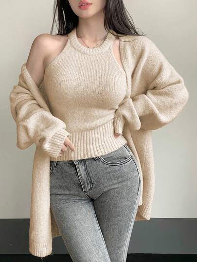 2 件套女士优雅纯色吊带背心开衫套装,秋季