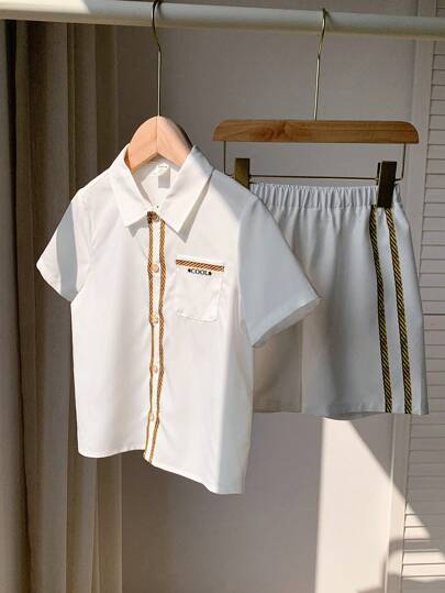 SHEIN 2入組年輕男孩休閒襯衫,格紋短袖衫帶口袋和短褲裝 - 白色 - 查看 5