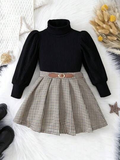 2 件套小女孩长袖针织套头衫 + 千鸟格半身裙套装小女孩服装派对礼物 - 黑色 - 查看 1