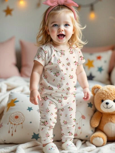 SHEIN Leap Crew 2 件装年轻女孩花卉卡通印花短袖 T 恤和裤子家居服套装,贴身合身,适合春夏季 - 彩色 - 查看 2
